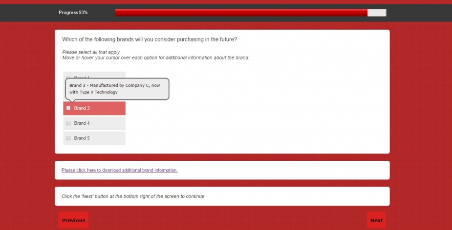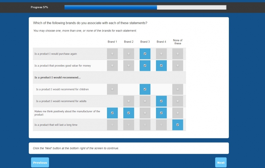 We offer question formats that maintain respondent interest such as image ‘drag and drop’ choices, slider rating scales, as well as complex survey design including Choice-Based Conjoint, Max Diff and SIMALTO question sets.